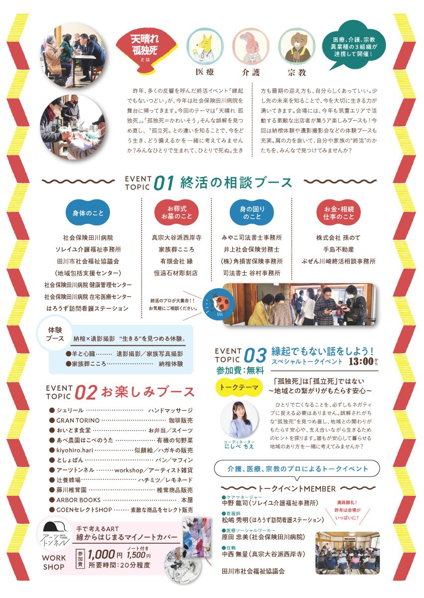 会場には、今年も身体のことやお葬式・お墓について、遺品整理や空き家問題、相続遺言のことまで親身に相談に乗ってくれるプロの方々が大集結!筑豊エリアで活動する素敵な出店者が集うお楽しみブースも!今回は納棺体験や遺影撮影会などの体験ブースも充実。今後の人生を豊かにするためにも楽しく「縁起でもないはなし」ができることを目的としています。