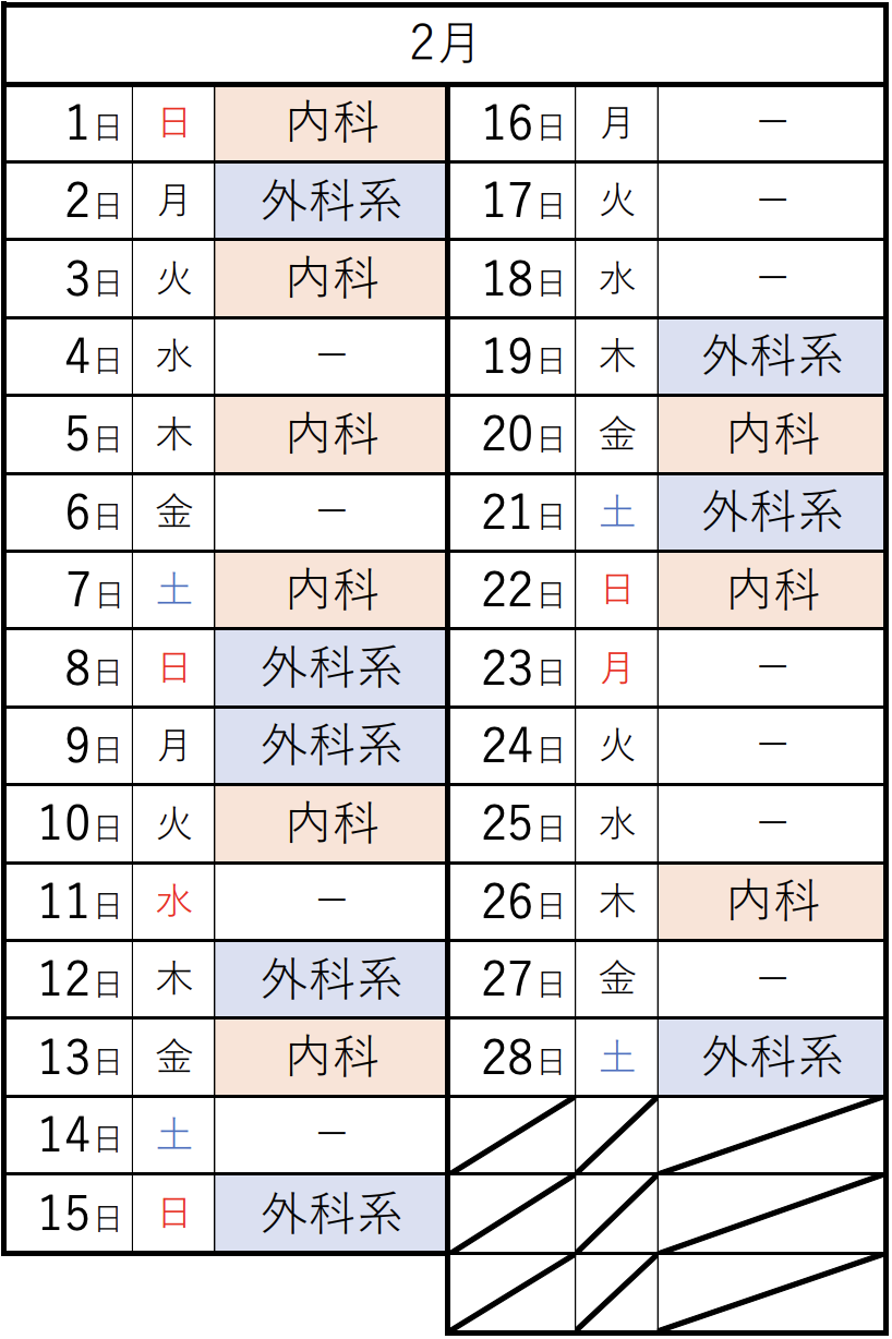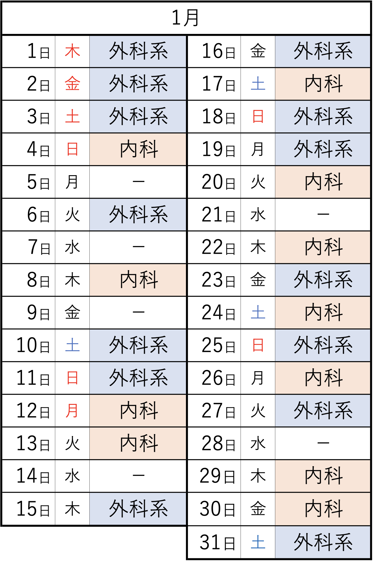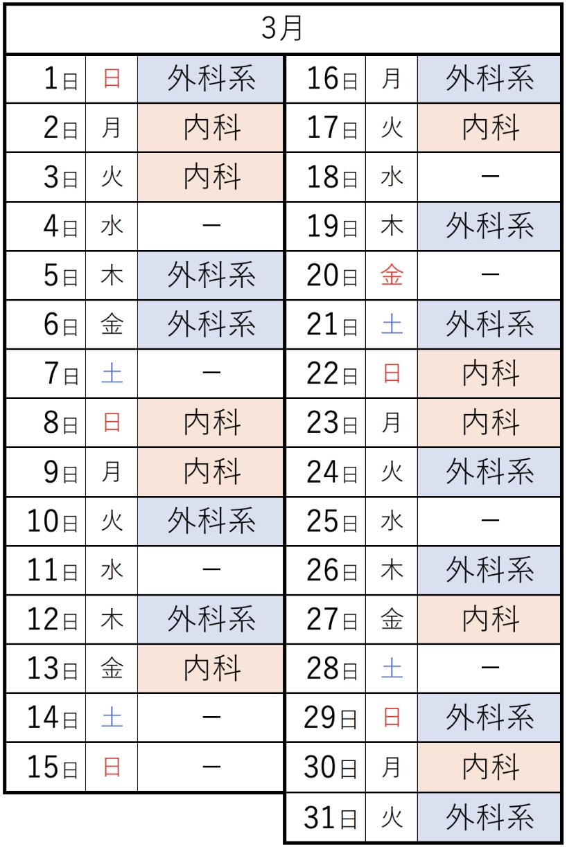 ※当番日でも受診できるとは限りませんので、必ず来院前にお電話ください。